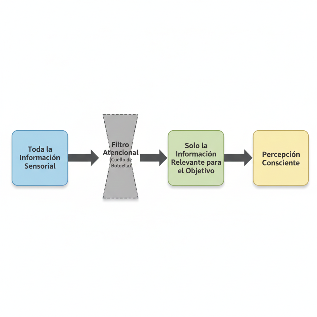 Tu cerebro es una máquina poderosa, pero con ancho de banda limitado. No puede procesar conscientemente los 11 millones de bits de información por segundo que reciben tus sentidos. Por eso, funciona con filtros:1. Filtro Sensorial: Selecciona estímulos básicos (movimiento, sonidos fuertes).2. Cuello de Botella Atencional: Aquí ocurre la magia (o la tragedia). Solo una pequeña fracción de la información pasa a tu conciencia. El criterio es la «pertinencia para el objetivo actual».3. Percepción Consciente: Solo lo que pasa el filtro se convierte en lo que tú «experimentas».Cuando tu objetivo es «encontrar las llaves», tu cerebro prioriza la forma, el color y el tamaño de las llaves. El frutero, el sobre, e incluso las llaves en tu otra mano pueden ser filtradas como «ruido». No es que tus ojos no las capturen; es que tu cerebro consciente nunca recibe la señal.