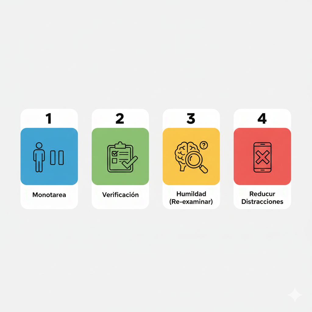 No puedes desactivar este filtro, pero sí puedes manejarlo con mayor sabiduría.1. Sé Monotarea en lo Crítico: Si estás buscando algo, detente por un segundo, respira y amplía tu foco consciente. Dile a tu cerebro: «Además de las llaves, observa el entorno completo».2. Practica la «Verificación Sistemática»: Pilotos y cirujanos usan listas de verificación (checklists) para forzar a su atención a pasar por todos los puntos críticos, evitando la ceguera por sobreconfianza.3. Asume que No Lo Viste Todo: Adoptar una actitud humilde («Puede que se me haya escapado algo») te predispone a hacer una segunda revisión con un objetivo ligeramente diferente.4. Reduce las Distracciones Cognitivas: La próxima vez que camines por la calle, guarda el teléfono. Le estás dando a tu cerebro la mejor oportunidad de ver el mundo (y los peligros) en su totalidad.